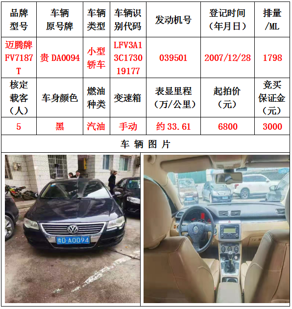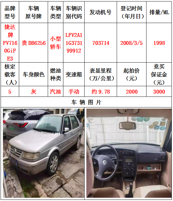 本次拍賣會(huì)的拍賣標(biāo)的其中5輛車,分別為邁騰牌FV7187T小型轎車一輛、豐田牌GTM7200GB-NAV1小型轎車一輛、捷達(dá)牌FV7160GiF E3小型轎車一輛、帕薩特牌SVW7203FPi小型轎車一輛、帕薩特牌SVW7203FPi小型轎車一輛,為打包整體拍賣,不作拆分,整體起拍價(jià):42400元,且只對標(biāo)的現(xiàn)狀進(jìn)行拍賣,不作任何質(zhì)量擔(dān)保。