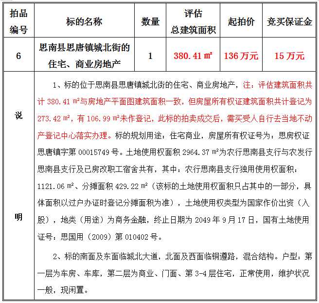 2、思南縣思唐鎮(zhèn)城北街的住宅、商業(yè)房地產(chǎn),建筑面積共:380.41㎡;起拍價(jià):136萬元;競買保證金15萬元。