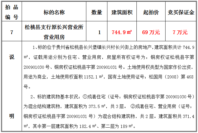 3、松桃縣支行原長興營業(yè)所營業(yè)用房,建筑面積共:744.9㎡;起拍價(jià):69萬元;競買保證金:7萬元。