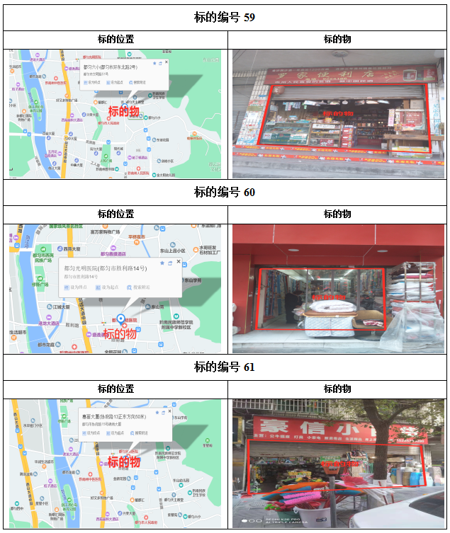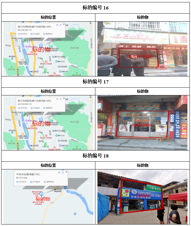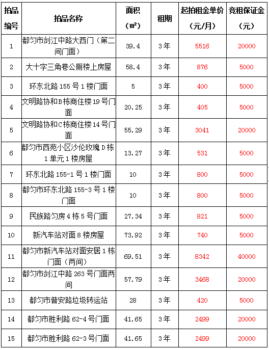 1、都勻市劍江中路、環(huán)東北路、文明路、民族路、勝利路、會(huì)云橋、育英巷等62處門面3年租賃權(quán),面積約5㎡-137.74㎡;