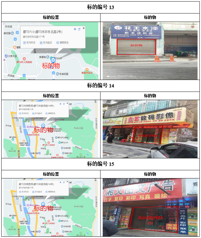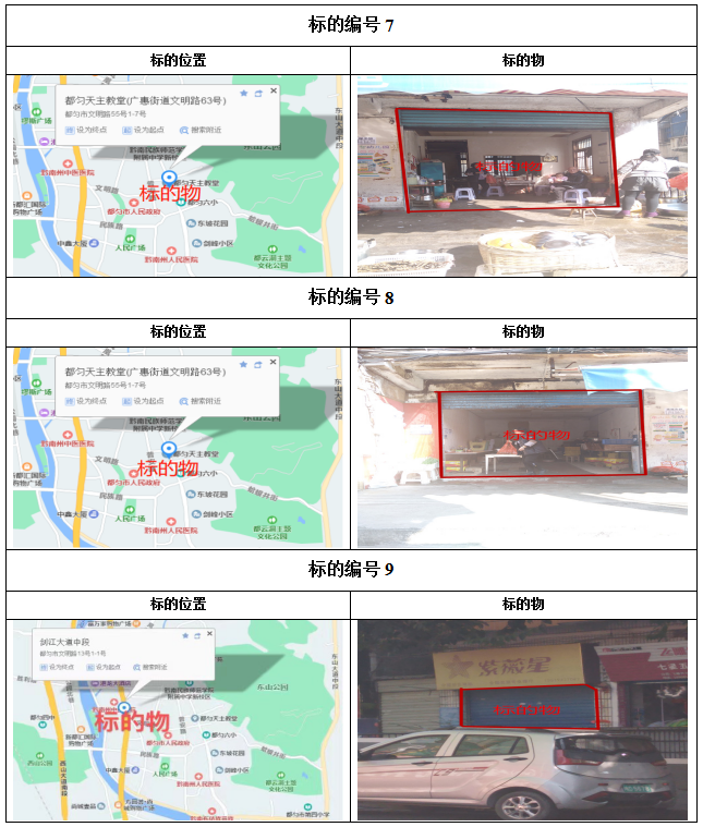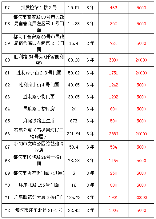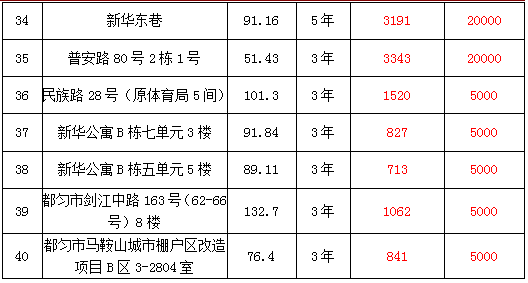 2、都勻市大十字三角巷、西苑小區(qū)、新汽車站對(duì)面、新華東巷、新華公寓、劍江中路、馬鞍山城市棚戶區(qū)、石惠公寓等10處房屋3年-5年租賃權(quán),面積約13.27㎡-221.94㎡;