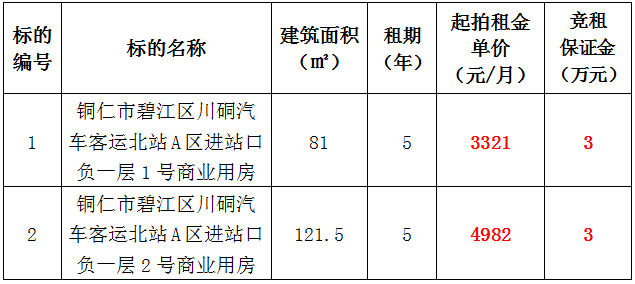 3、銅仁市碧江區(qū)川硐汽車客運(yùn)北站A區(qū)進(jìn)站口負(fù)一層3號(hào)門面,面積:121.5㎡,租賃期:5年,起拍租金:4738.5元/月,競(jìng)租保證金:3萬元;