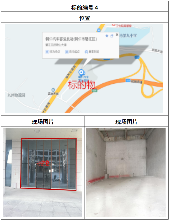 4、銅仁市碧江區(qū)川硐汽車客運(yùn)北站A區(qū)進(jìn)站口負(fù)一層4號(hào)門面,面積:121.5㎡,租賃期:5年,起拍租金:4738.5元/月,競(jìng)租保證金:3萬元;