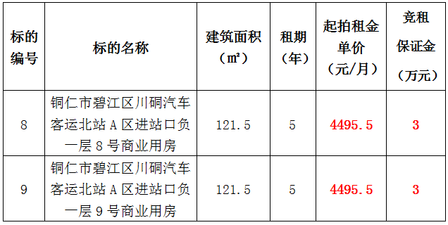 8、銅仁市碧江區(qū)川硐汽車客運(yùn)北站A區(qū)進(jìn)站口負(fù)一層8號(hào)門面,面積:121.5㎡,租賃期:5年,起拍租金:4495.5元/月,競(jìng)租保證金:3萬元;