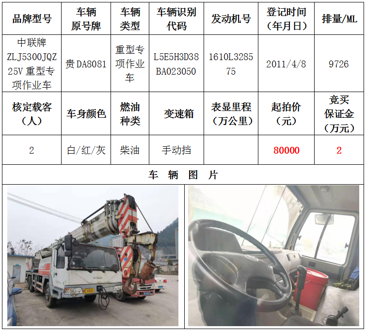 1、中聯(lián)牌重型專項(xiàng)作業(yè)車一輛,起拍價(jià):80000元,競(jìng)買保證金:2萬(wàn)元;
