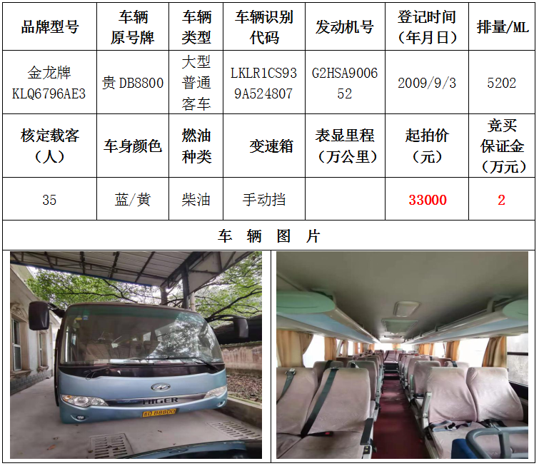 2、金龍牌大型普通客車一輛,起拍價(jià):33000元,競(jìng)買保證金:2萬(wàn)元;