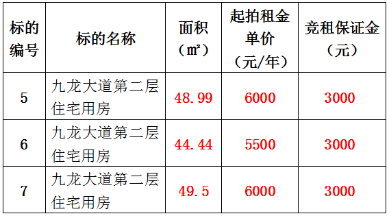5、九龍大道第二層住宅用房1號(hào)、2號(hào)、3號(hào),面積分別為:48.99㎡、44.44㎡、49.5㎡,租賃期均為:3年,起拍租金單價(jià)分別為:6000元/年、5500元/年、6000元/年,競(jìng)租保證金分別為:3000元;