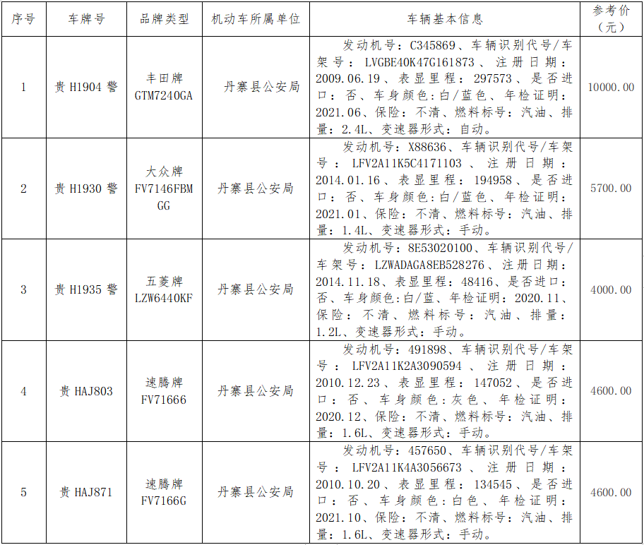 受委托,本公司于2021年9月28日(星期二)下午14∶30時,在丹寨縣公安局六樓會議室,對以下標的物按現(xiàn)狀現(xiàn)樣進行公開拍賣。