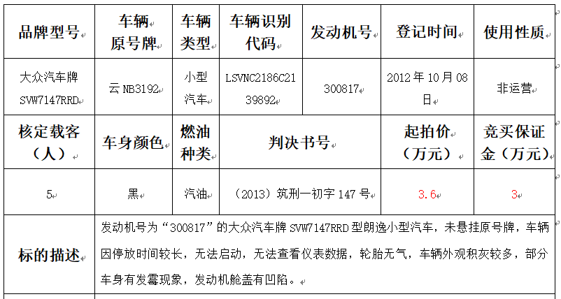 拍品編號(hào)1:大眾汽車牌SVW7147RRD朗逸小型汽車一輛