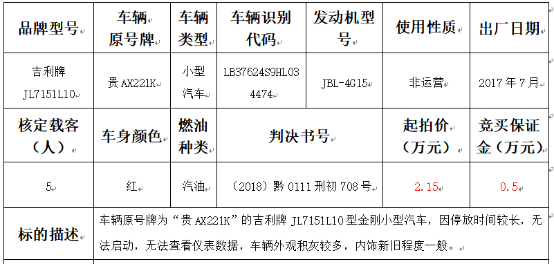 拍品編號(hào)3:吉利牌JL7151L10型金剛小型汽車一輛