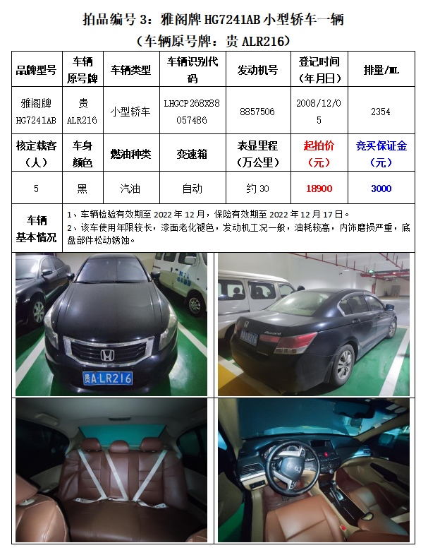 2、雅閣牌HG7241AB小型轎車1輛;