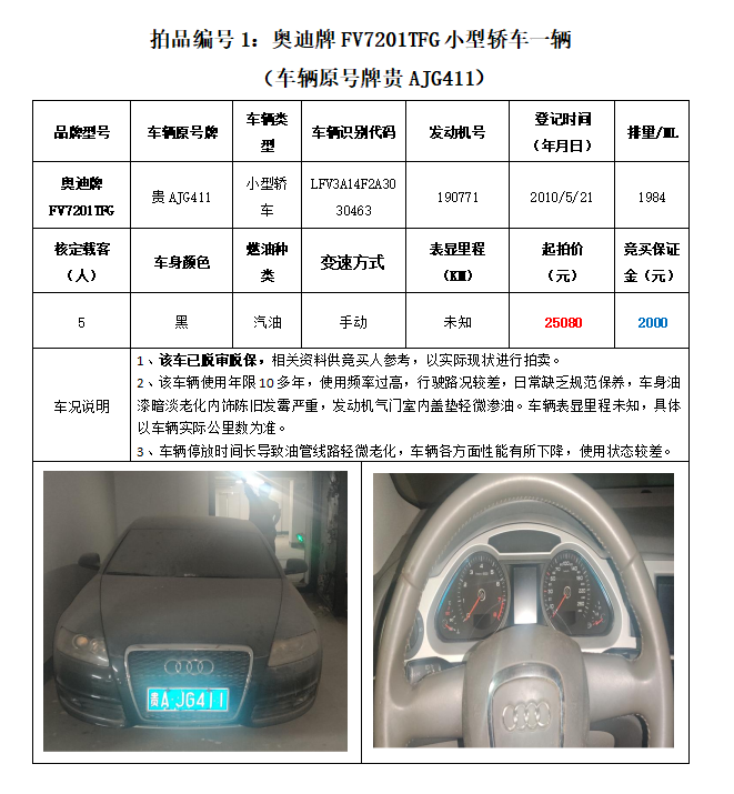 拍品編號(hào)1:原車牌號(hào)貴AJG411奧迪牌FV7201TFG小型轎車一輛;