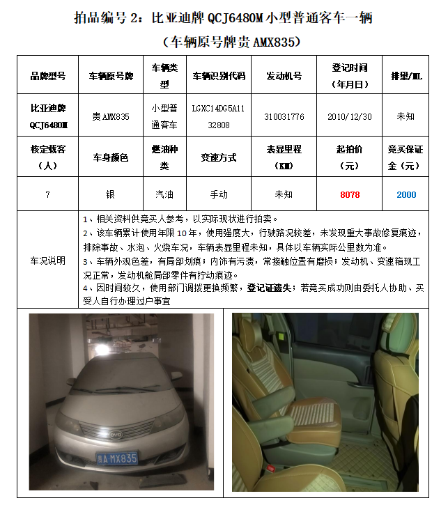 拍品編號(hào)2:原車牌號(hào)貴AMX835比亞迪牌QCJ6480M小型普通客車一輛;