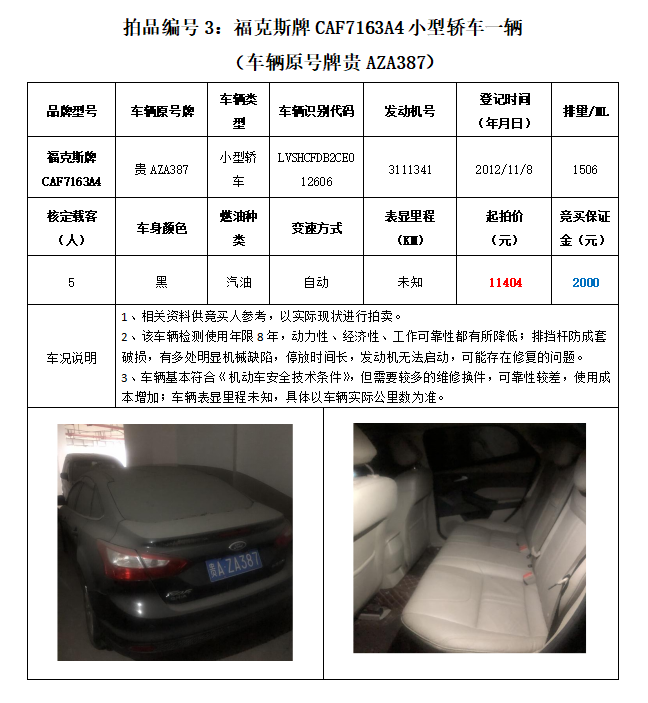 拍品編號(hào)3:原車牌號(hào)貴AZA387??怂古?/span>CAF7163A4小型轎車一輛;