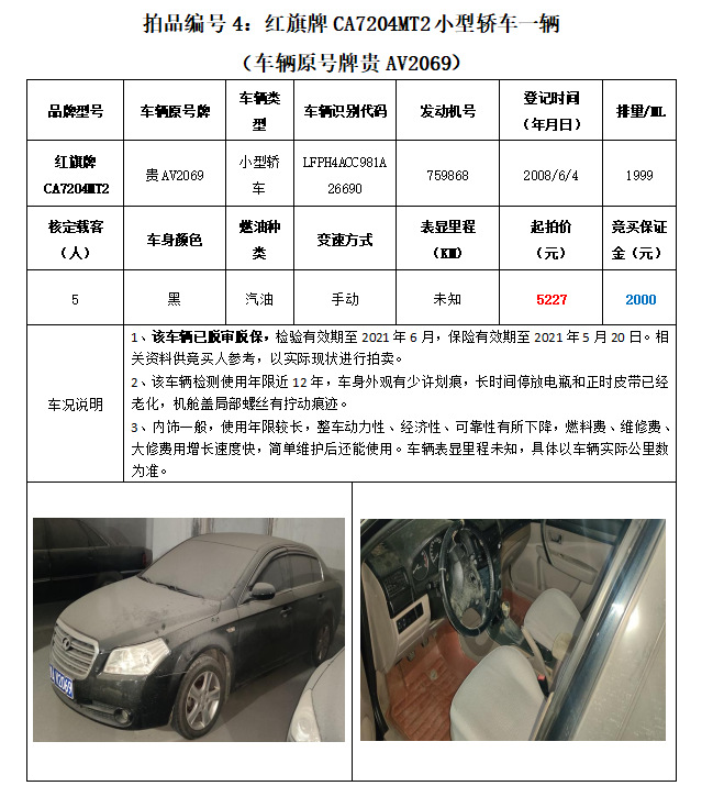 拍品編號(hào)4:原車牌號(hào)貴AV2069紅旗牌CA7204MT2小型轎車一輛;