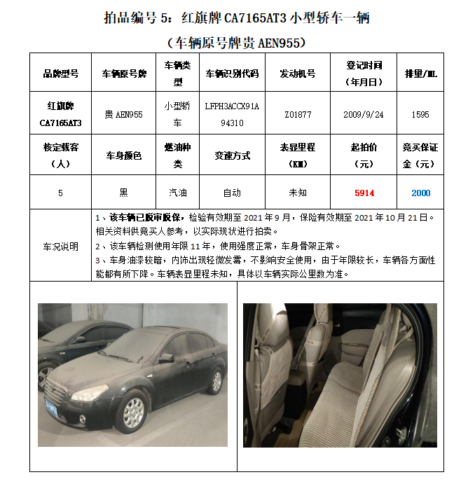 拍品編號(hào)5:原車牌號(hào)貴AEN955紅旗牌CA7165AT3小型轎車一輛;
