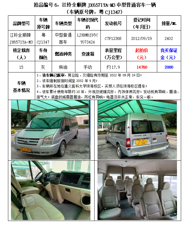 拍品編號(hào)6:原車牌號(hào)粵CJ1347江鈴全順牌JX6571TA-M3中型普通客車一輛;