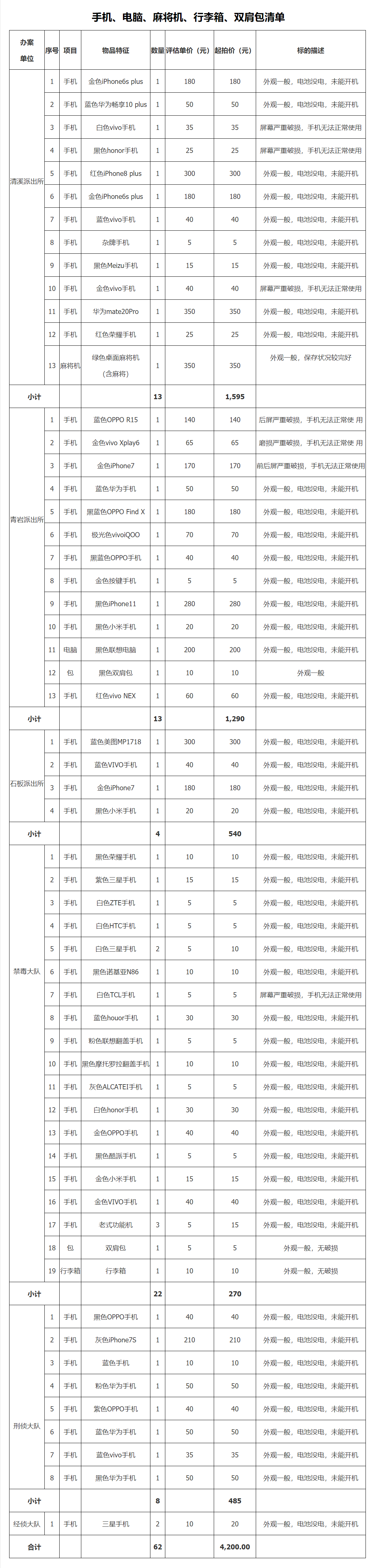 “手機(jī)、電腦、麻將機(jī)、行李箱、雙肩包”一批(整體拍賣,各類品牌手機(jī)57部、麻將機(jī)1臺(tái)、電腦1臺(tái)、行李箱1個(gè)、雙肩包2個(gè))(詳見后附手機(jī)、電腦、麻將機(jī)、行李箱、雙肩包清單)