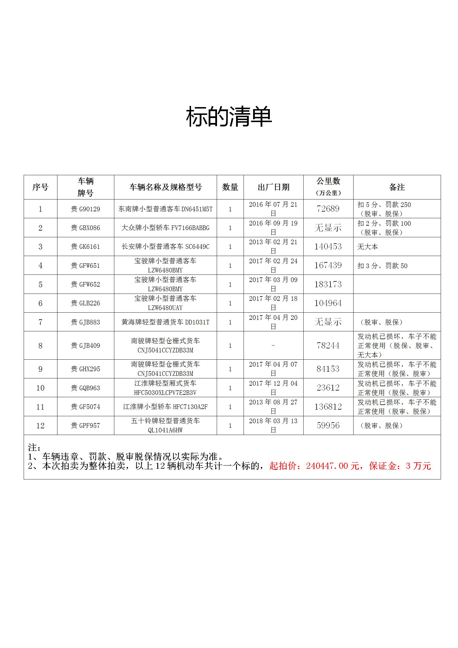 大眾牌、寶駿牌、東南牌、黃海牌、長(zhǎng)安牌、南俊牌等12輛公務(wù)用車整體打包拍賣